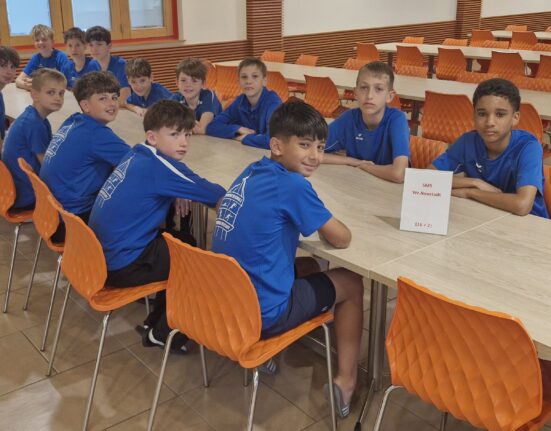 Freitag Punkt Mittag endete das U13-Trainingscamp 2025 in Lindabrunn mit einem leckeren Kürbiskernschnitzel. Nach dem Aufstehen wurden innerhalb von 45 Minuten sämtliche Zimmer geräumt und sauber hinterlassen. Danach hatten die 2a-ler noch ein Rendezvous mit einer Physik-Lernzielkontrolle. Schließlich ging es auch schon ein letztes Mal auf den Trainingsplatz. Der mittlerweile bereits traditionelle Torabschlussbewerb, bei dem man in ca. 70 Sekunden 13 Abschlüsse unter Stress und Atemnot fabrizieren musste, sorgte für Aufregung. Nach zwei Durchgängen war es Jan Ponweiser, der zum ersten Mal in der Geschichte des Bewerbs ALLE Abschlüsse im Tor unterbrachte. Respekt! Aber auch alle anderen, inklusive Torhüter, zeigten ihre Qualität. Nachdem das Trainingsgewand verstaut war, ging es zum Mittagessen, ehe die Kids der Reihe nach von ihren Eltern abgeholt wurden. Fazit: Nach dem Gewinn des Bundesmeistertitels darf sich die SportMS zu Recht als Spitzenteam bezeichnen. Im einzigen Test der Woche konnte Zwettl glatt mit 11:1 geschlagen werden, die anderen vier Schulen verzichteten auf ein Treffen, was sicherlich Sinn machte. Die sportlichen Ziele wurden absolut erreicht. Was aber noch zu einem Spitzenteam gehört, ist auch das Verhalten abseits des Platzes. Sei es beim gemeinsamen Essen im Speisesaal (pünktlich beim Treffpunkt, alle im Schulgewand, Tischmanieren, Höflichkeit), bei den Lerneinheiten (selbstständiges Erarbeiten des Wochenstoffs) oder in den Zimmern (keine Zimmerwechsel, Sauberkeit, Ruhe im Zimmer und in den Gängen): Die U13 präsentierte sich in Topzustand. An dieser Stelle ein großes Lob vom Trainerteam Blazanovic/Sahlenegger, das die Regeln im Vorfeld klar absteckte und somit keine Missverständnisse aufkommen ließ. Nach zwei anstrengenden Wochen freuen sich alle wieder auf den „Alltag“ in der Schule. Sportlich geht es nach den Osterferien weiter, wenn das Bezirksfinale gegen das BG Zehnergasse wartet (23. April). Die Landesmeisterschaft wird dann an den Mittwochen im Mai (7.5., 14.5., 21.5., Finale wäre am 28. Mai in Neudorf) ausgetragen. Ziel ist natürlich, das Double, sprich den Landesmeistertitel, zu schaffen. Daran wird man diese Mannschaft messen…