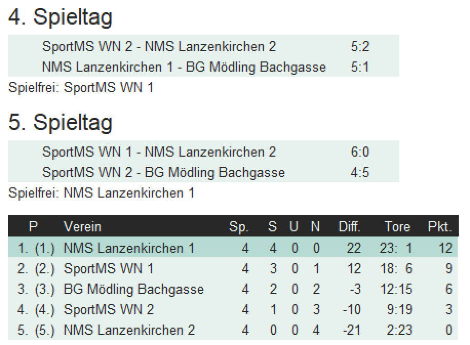 Am Dienstag war die SportMS Austragungsort des Tischtennis-Mädchen-Schülerliga-Regionalturniers. Fünf Teams aus drei Schulen spielten einen Platz im Landesfinale Ende Februar in Oberndorf auf. Am stärksten waren heuer die Mädchen aus der NMS Lanzenkirchen, die all ihre Partien gewinnen konnten. Mödling landete auf Rang 3. Das Zweierteam der SportMS konnte das direkte Duell gegen Lanzenkirchen II für sich entscheiden und schrammte gegen Mödling ganz knapp am Sieg vorbei, was am Ende Platz 4 bedeutete. Unser Einserteam matchte sich mit Lanzenkirchen I um den Turniersieg. Trotz klarer Niederlage im direkten Duell ging es in einigen Vergleichen ziemlich knapp zu. Auf Rang zwei kann man aufbauen, vor allem, weil bis auf zwei Viertklässlerinnen nächstes Jahr alle wieder dabei sind…