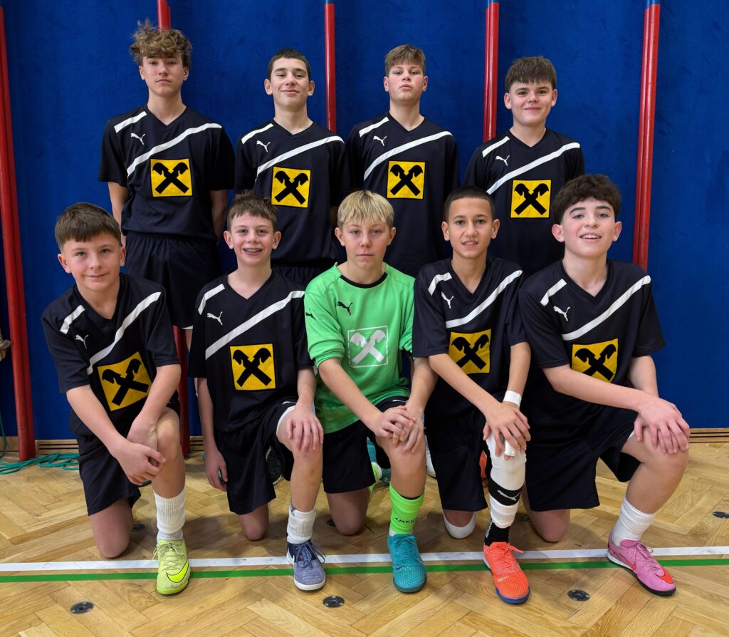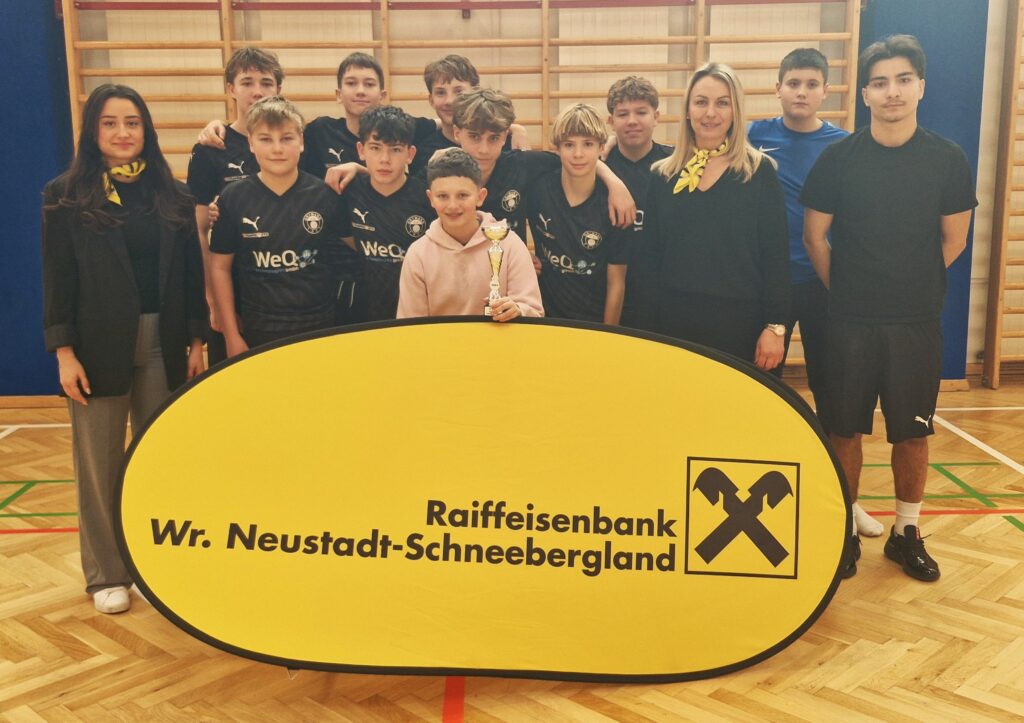 Am Donnerstag fand der U15-Raiffeisen-Futsal-Cup in der Sporthalle der SportMS Wr. Neustadt statt. Sechs Teams, darunter zwei aus dem Bezirk WN-Land, waren mit dabei. Die Visiere wurden dabei mit Fortdauer des Turniers immer besser eingestellt, sodass sich zahlreiche spannende Spiele entwickelten. Nach einer „Jeder gegen Jeden“-Runde kam es zu den Platzierungsspielen. Um den fünften Platz setzte sich Wiesmath gegen die Europamittelschule durch. Im kleinen Finale blieb die SportMS im Derby gegen das BG Zehnergasse siegreich. Im Finale kam es zum Aufeinandertreffen der beiden einzigen ungeschlagenen Teams, der SportMS I, sowie der NMS Pernitz. Schon im Grunddurchgang endete dieses Duell Remis, und auch im Finale konnte sich keines der beiden Teams einen entscheidenden Vorteil verschaffen. So kam es zu einem torlosen Unentschieden, sodass ein Penaltyschießen den Sieger ermitteln musste. Hier verschossen die Pernitzer den letzten Strafstoß, damit sicherte sich das Einserteam des Gastgebers den Sieg bei diesem Turnier. Bei der Siegerehrung übernahmen die Vertreter der Raiffeisenbank Wr. Neustadt-Schneebergland, Regionalleiterin Stephanie Koch und Jugendbetreuerin Arbesa Rragamaj das Überreichen der Pokale. Dafür ein herzliches Dankeschön!