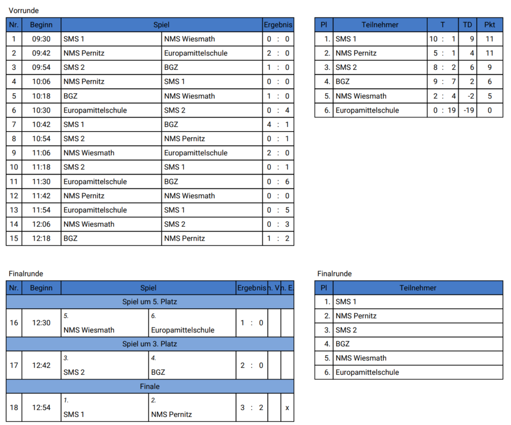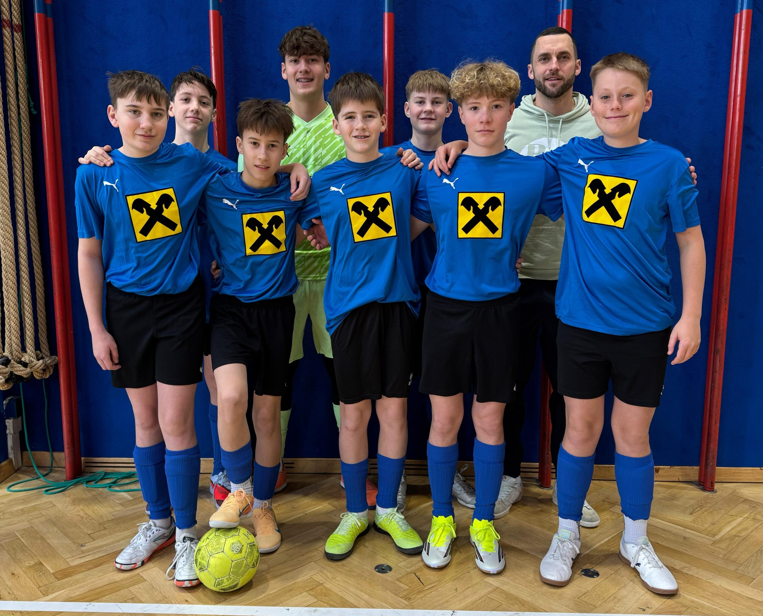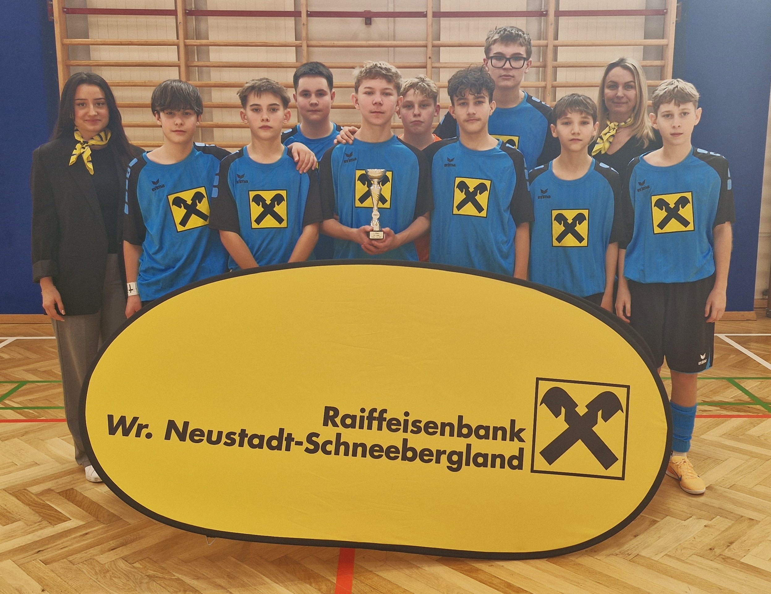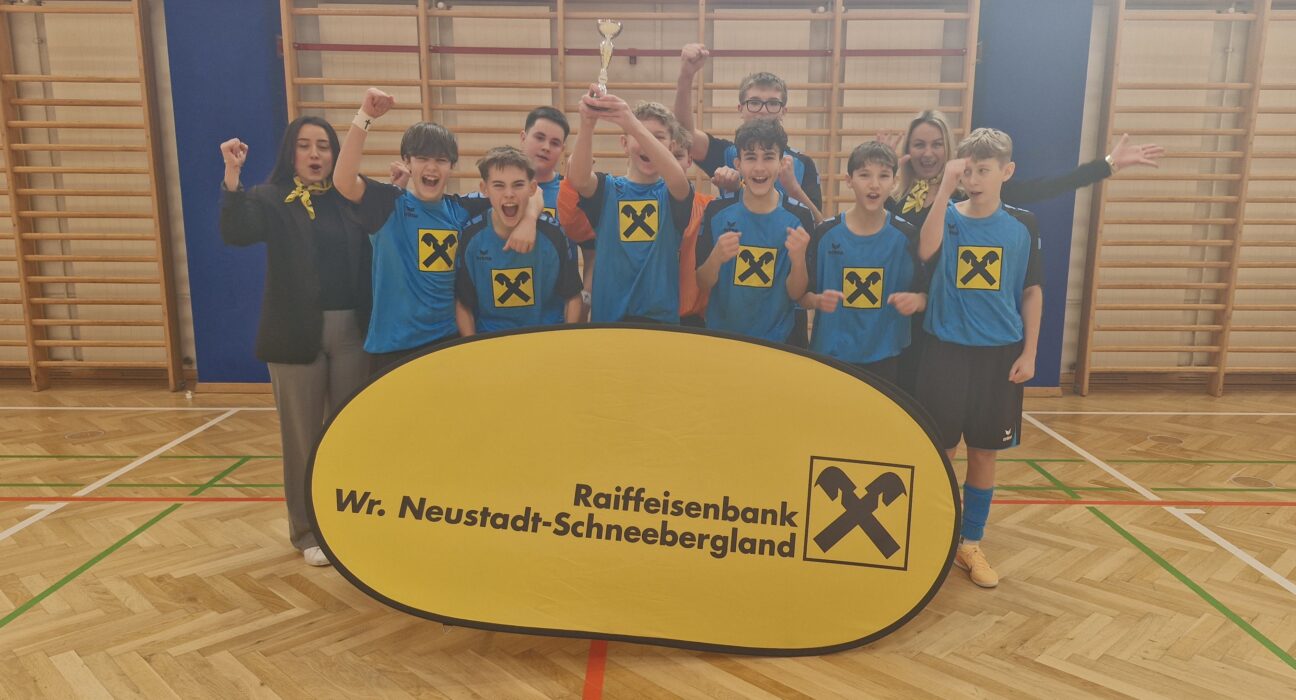 Am Donnerstag fand der U15-Raiffeisen-Futsal-Cup in der Sporthalle der SportMS Wr. Neustadt statt. Sechs Teams, darunter zwei aus dem Bezirk WN-Land, waren mit dabei. Die Visiere wurden dabei mit Fortdauer des Turniers immer besser eingestellt, sodass sich zahlreiche spannende Spiele entwickelten. Nach einer „Jeder gegen Jeden“-Runde kam es zu den Platzierungsspielen. Um den fünften Platz setzte sich Wiesmath gegen die Europamittelschule durch. Im kleinen Finale blieb die SportMS im Derby gegen das BG Zehnergasse siegreich. Im Finale kam es zum Aufeinandertreffen der beiden einzigen ungeschlagenen Teams, der SportMS I, sowie der NMS Pernitz. Schon im Grunddurchgang endete dieses Duell Remis, und auch im Finale konnte sich keines der beiden Teams einen entscheidenden Vorteil verschaffen. So kam es zu einem torlosen Unentschieden, sodass ein Penaltyschießen den Sieger ermitteln musste. Hier verschossen die Pernitzer den letzten Strafstoß, damit sicherte sich das Einserteam des Gastgebers den Sieg bei diesem Turnier. Bei der Siegerehrung übernahmen die Vertreter der Raiffeisenbank Wr. Neustadt-Schneebergland, Regionalleiterin Stephanie Koch und Jugendbetreuerin Arbesa Rragamaj das Überreichen der Pokale. Dafür ein herzliches Dankeschön!